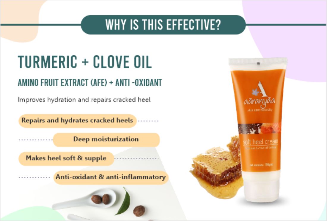 FOOT REPAIR CREAM : Amino Fruit Extracts (AFE) from SHEA BUTTER+ TURMERIC+CLOVE OIL will act as anti-inflammatory, anti-oxidant, anti-bacterial and soothing. Protects skin from free radicals, removes wrinkles and scar marks, provides deep moisturization, stimulates synthesis of collagen, and rejuvenates skin cells.